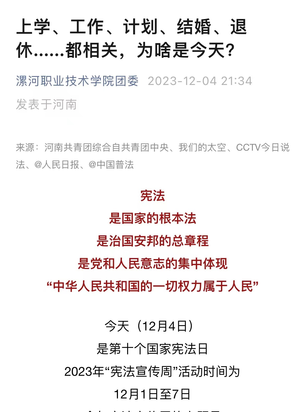 今年12月4日是第10个国家宪法日,为深入学习贯彻党的二十大精神,深入学习宣传习近平法治思想,进一步普及宪法知识、弘扬宪法精神,树立宪法意识弘扬宪法精神,维护宪法权威,按照《河南省教育厅办公室关于开展2023年全省教育系统“宪法宣传周”系列活动的通知》《中共漯河市委全面依法治市委员会守法普法协调小组 中共漯河市委宣传部 漯河市司法局关于开展“宪法宣传周”系列宣传活动的通知》等文件精神,学校以“大力弘扬宪法精神 建设社会主义法治文化”为主题,组织开展了形式多样的主题宣传活动。